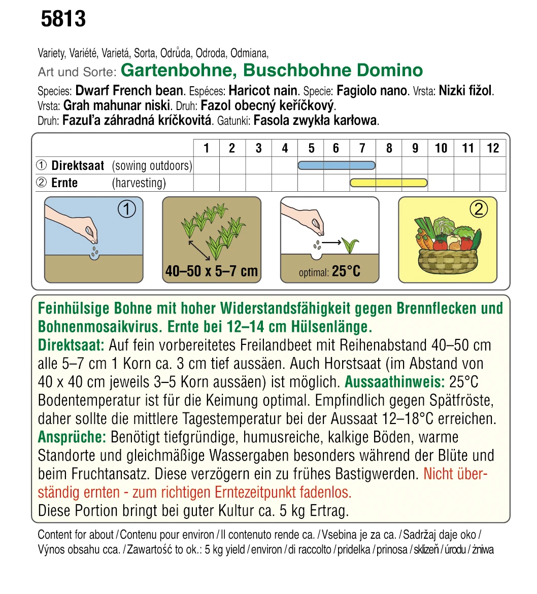 Feinhülsige Bohne mit hoher Widerstandsfähigkeit gegen Brennflecken und Bohnenmosaikvirus. Ernte bei 12-14 cm Hülsenlänge