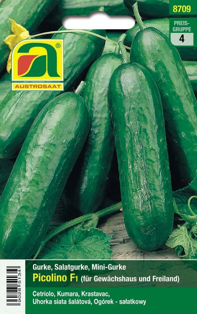 Die Austrosaat Gurke Picolino F1 (Cucumis sativus L.) ist eine Snackgurke mit 12 – 13 cm langen Früchten. Die Kultur sollte aufgeleitet (benötigt Rankhilfe) im Glashaus oder an sehr geschützten Standorten im Freien erfolgen. Gurke Picolino F1 ist resistent gegen Blattbrand und Gurkenkrätze und widerstandsfähig gegen Echten Mehltau und Gurkenmosaikvirus.