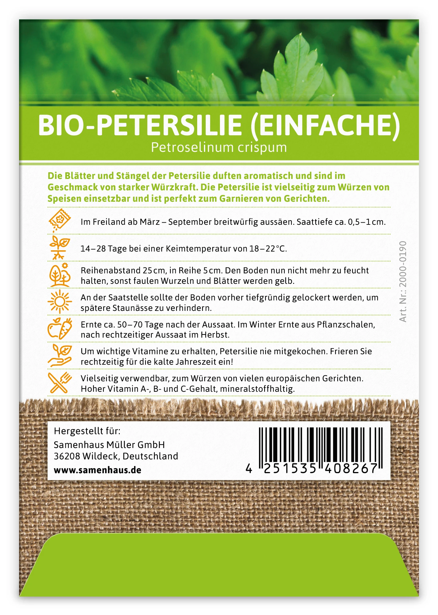 Die Blätter und Stängel der Petersilie duften aromatisch und sind im Geschmack von starker Würzkraft. Die Petersilie ist vielseitig zum Würzen von Speisen einsetzbar und ist perfekt zum Garnieren von Gerichten.