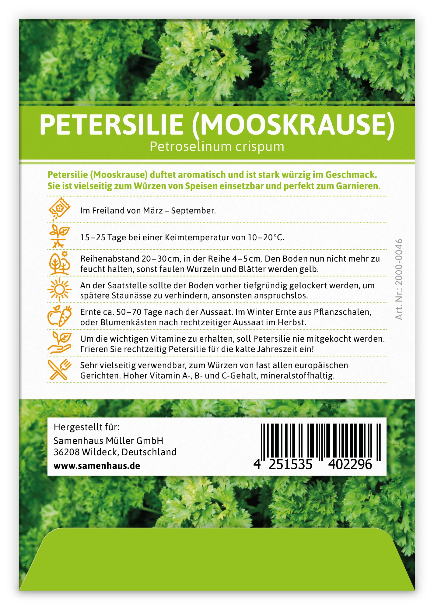 Petersilie (Mooskrause) duftet aromatisch und ist stark würzig im Geschmack. Sie ist vielseitig zum Würzen von Speisen einsetzbar und perfekt zum Garnieren.