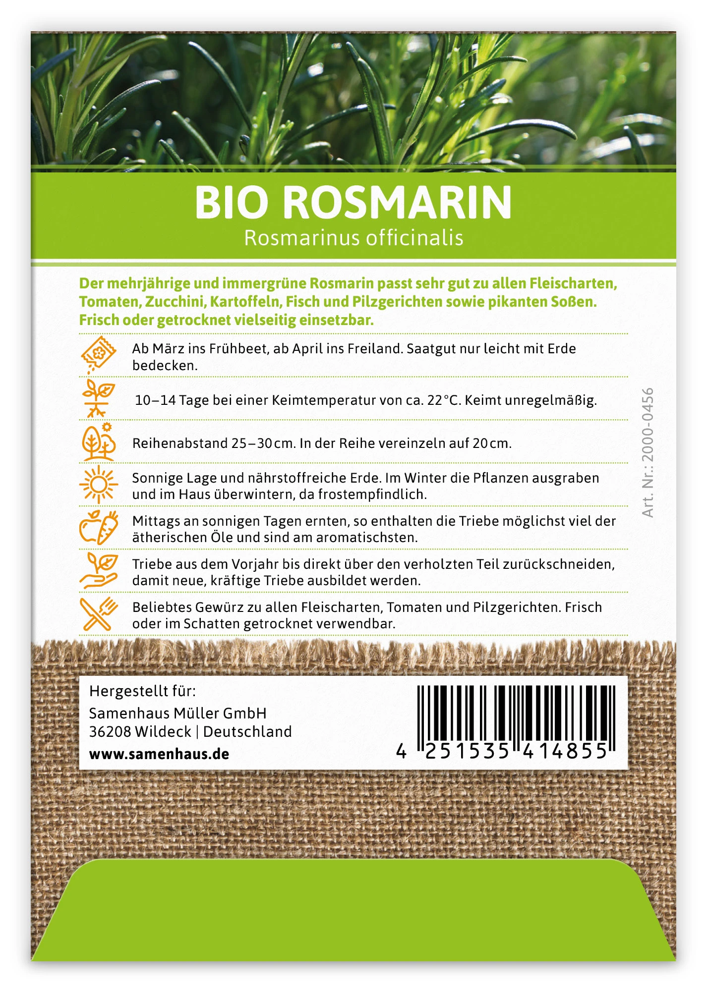 Der mehrjährige und immergrüne Rosmarin passt sehr gut zu allen Fleischarten, Tomaten, Zucchini, Kartoffeln, Fisch und Pilzgerichten sowie pikanten Soßen. Frisch oder getrocknet vielseitig einsetzbar.