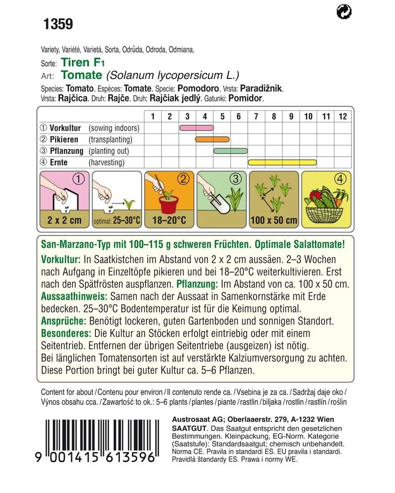 Austrosaat Gourmet Edition Salat-Tomate Tiren F1 (Solanum lycopersicum L.) ist eine Tomate vom San-Marzano-Typ mit 100 – 115 g schweren Früchten. Sie ist die optimale Salattomate!