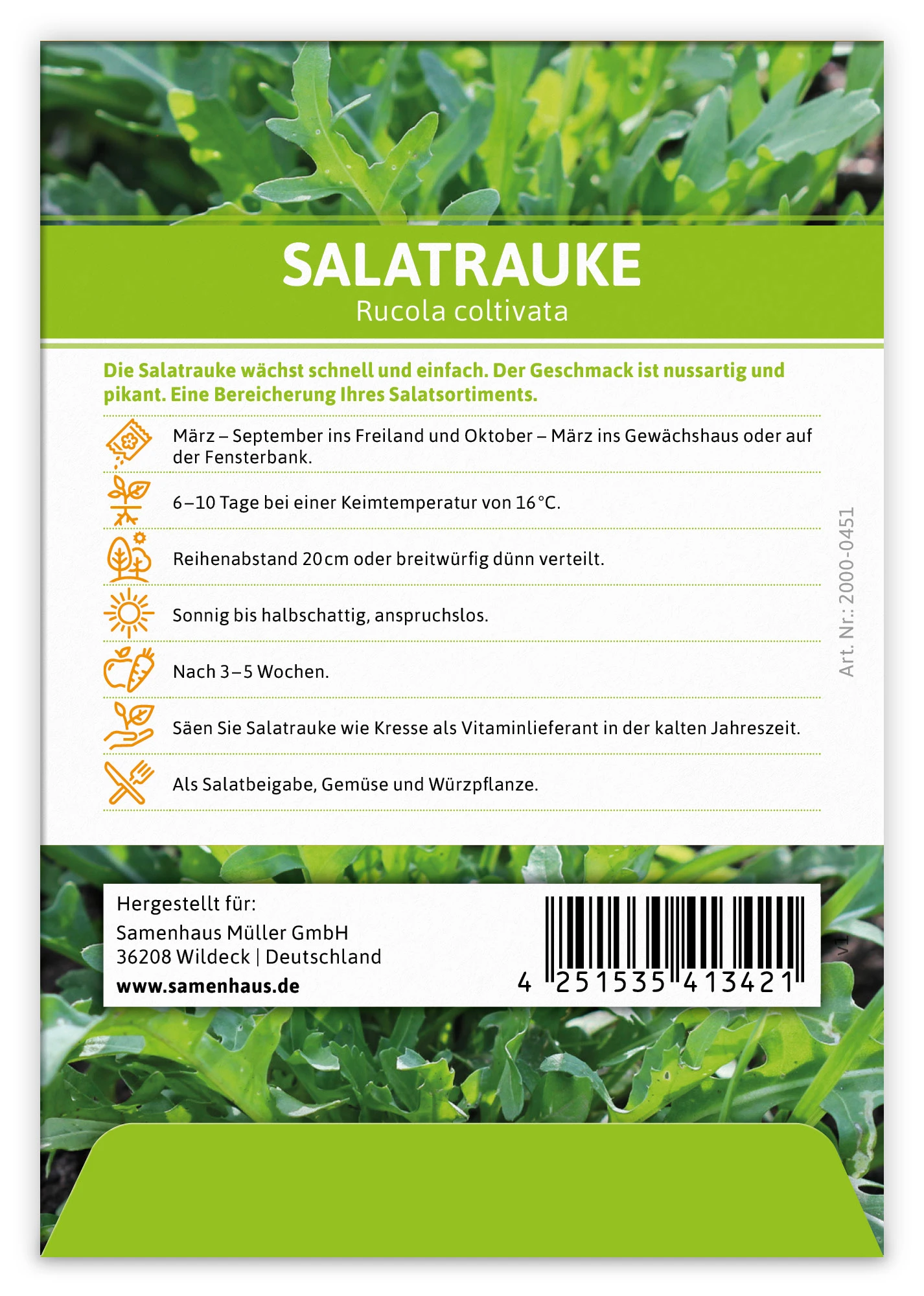 Die Salatrauke wächst schnell und einfach. Der Geschmack ist nussartig und pikant. Eine Bereicherung Ihres Salatsortiments.