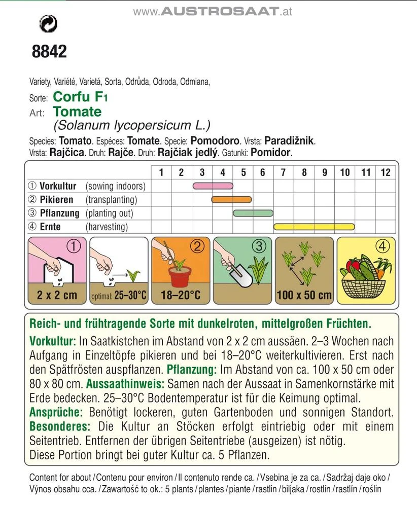 Die Austrosaat Tomate Corfu F1 (Solanum lycopersicum L.) ist eine reich- und frühtragende Sorte mit mittelgroßen, dunkelroten, gleichmäßigen, festbleibenden Früchte. Die Kultur an Stöcken erfolgt eintriebig oder mit einem Seitentrieb.