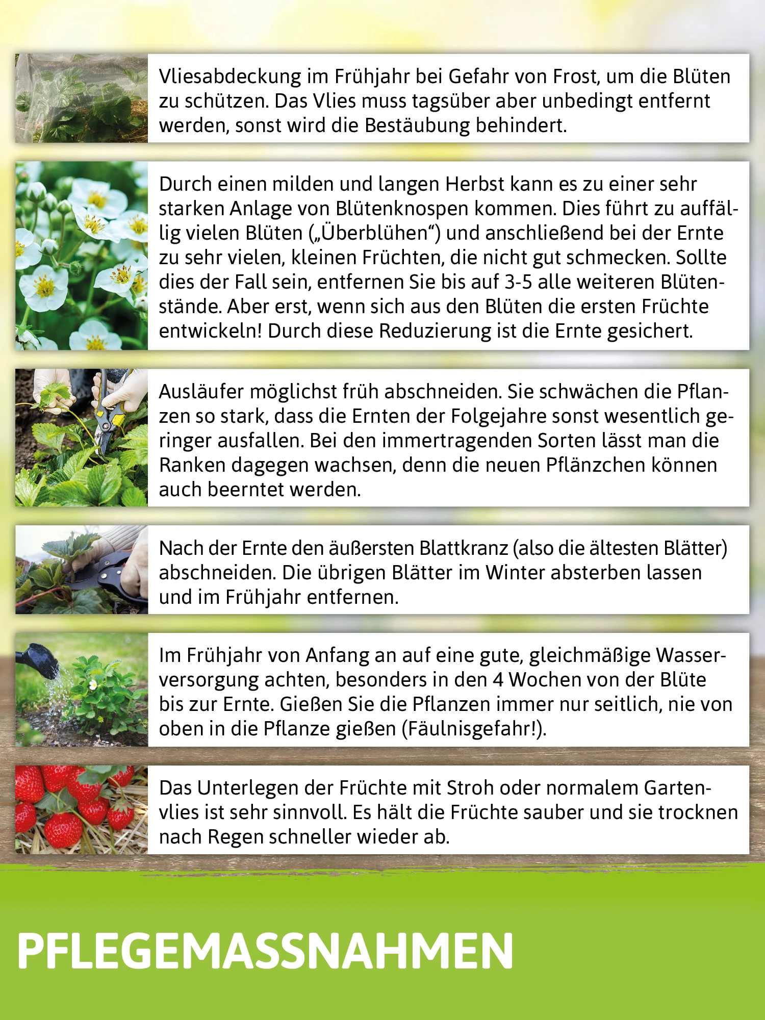 Im Beet sollten Sie die Walderdbeeren Waldfee 14-tägig düngen, im Balkonkasten ist eine wöchentliche Düngung notwendig. Dafür eignet sich ein Flüssigdünger für Blühpflanzen. Entfernen Sie alte Blätter erst im Frühjahr.
