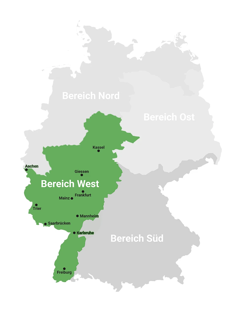 Aachen, Kassel, Giessen, Trier, Mainz, Frankfurt, Saarbrücken, Mannheim, Karlsruhe, Freiburg