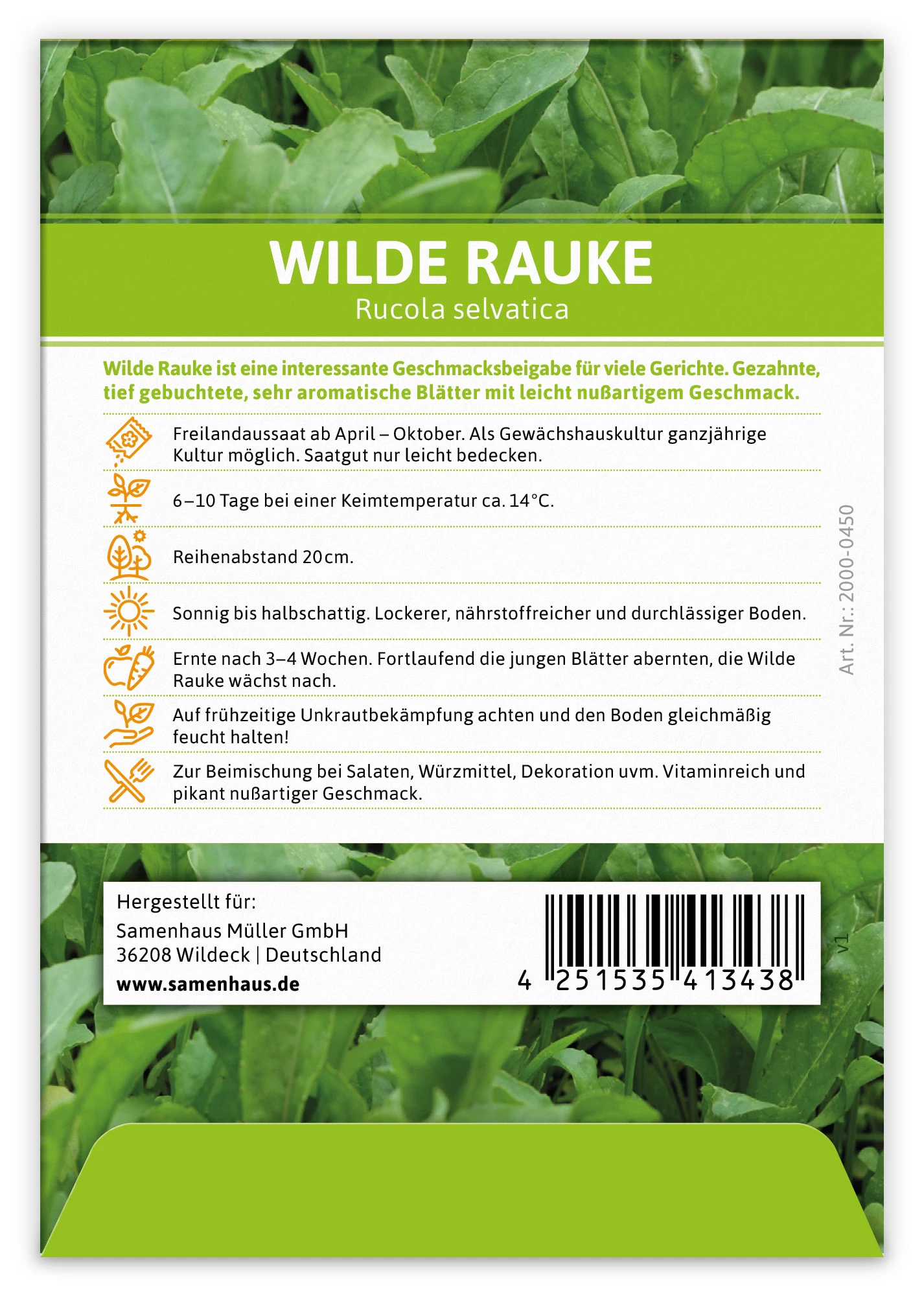 Wilde Rauke ist eine interessante Geschmacksbeigabe für viele Gerichte. Gezahnte, tief gebuchtete, sehr aromatische Blätter mit leicht nussartigem Geschmack.